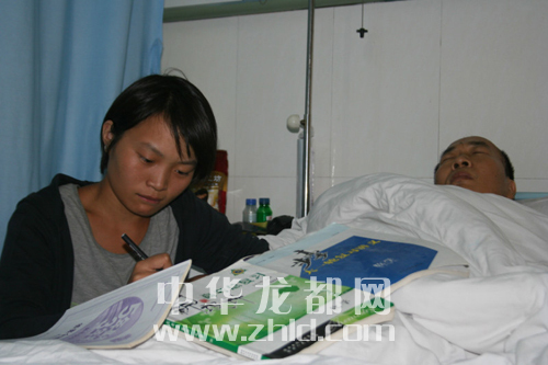 韓金霞趁父親睡時在病房學習