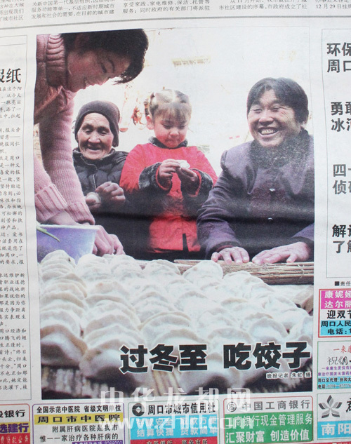 ????創(chuàng)刊號頭版壓軸圖片《過冬至,吃餃子》,拍攝的是80多歲的姥姥、50多歲的媽媽、30多歲的媳婦、五六歲的小女孩四世同堂歡天喜地包餃子的場景。媳婦搟餃子皮,姥姥、媽媽包餃子,五六歲的小女孩也來湊熱鬧,拿起一個餃子皮學(xué)著大人的模樣包餃子,剛剛包好的一大鍋蓋餃子令人垂涎。特別是按照晚報的送報時間,創(chuàng)刊號報紙送到千家萬戶時正好是上午11時之前,此時正是人們包好餃子準(zhǔn)備煮餃子的時間??上攵蠹乙贿吰纷x屬于周口人自己的晚報、欣賞和諧家庭歡天喜地包餃子的圖片,一邊把包好的餃子下到沸騰的開水鍋里,那煮出的餃子香味和著晚報濃濃的墨香,香飄滿城,沁人心脾。