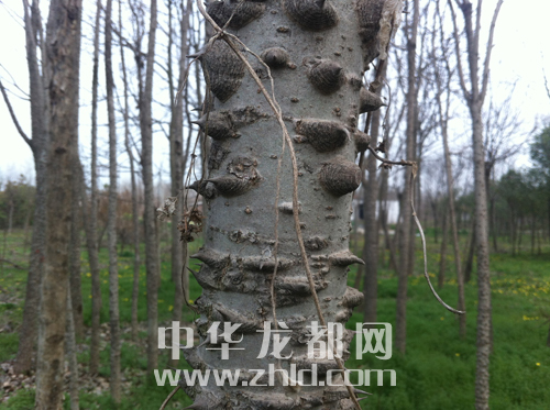 ????從高臺(tái)上走下,記者繼續(xù)行走在紅花綠樹之間,一棵渾身長(zhǎng)滿尖刺的大樹吸引了記者的目光。只見該樹有碗口粗細(xì),全身長(zhǎng)滿了長(zhǎng)刺,如果有人不小心碰到樹干,非得扎出血來(lái)不可。“它的名字叫‘刺楸’,是我國(guó)稀有樹種之一,十分罕見!”常年在森林公園看護(hù)樹木的馬松濤介紹,“夏天時(shí),刺楸樹上的每個(gè)刺旁邊都會(huì)長(zhǎng)出一片綠色的葉子,從遠(yuǎn)處看,整個(gè)樹干被樹葉包裹得嚴(yán)嚴(yán)實(shí)實(shí)。”