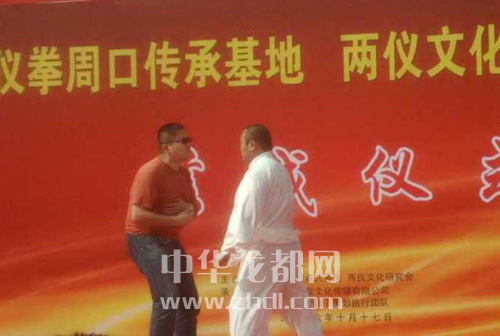 ????當(dāng)日,在兩儀拳周口傳承基地揭牌和兩儀文化周口發(fā)展中心落成儀式上,兩儀拳傳承人分別做了兩儀拳展示和兩儀養(yǎng)生功夫表演。隨后,段保華的弟子高躍鑫請現(xiàn)場觀眾上臺體驗兩儀拳點穴。一位身材高大、體重近100公斤的彪形大漢應(yīng)聲上臺。彪形大漢與高躍鑫交流后,表示已準備完畢。話音剛落,彪形大漢就被點中穴道,立即倒地。讓人驚奇的是,解穴后,彪形大漢隨即恢復(fù)正常?!耙郧奥犝f過兩儀拳的威力很大,沒想到會這么大?!北胄未鬂h說。