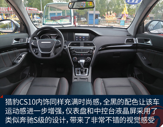 獵豹CS10內(nèi)飾同樣充滿時(shí)尚感,全黑的配色讓CS10的運(yùn)動(dòng)感進(jìn)一步增強(qiáng),儀表盤和中控臺(tái)液晶屏采用了類似奔馳S級(jí)車型的貫通式設(shè)計(jì),帶來了非常不錯(cuò)的視覺感受。用料方面,中控臺(tái)上方面板為搪塑工藝,手感較軟,并且還進(jìn)行了仿縫線處理,讓整個(gè)內(nèi)飾看起來很有質(zhì)感。