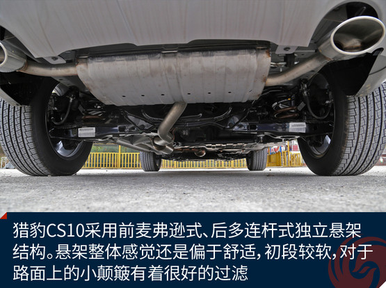獵豹CS10采用前麥弗遜式、后多連桿式獨(dú)立懸架結(jié)構(gòu),相比同級(jí)別扭力梁車型多多少少提升了一定的操控感。懸架整體感覺還是偏于舒適,初段較軟,對(duì)于路面上的小顛簸有著很好的過濾,在彎中的支撐力也較有韌性,過彎時(shí)的側(cè)傾控制的比較不錯(cuò)。