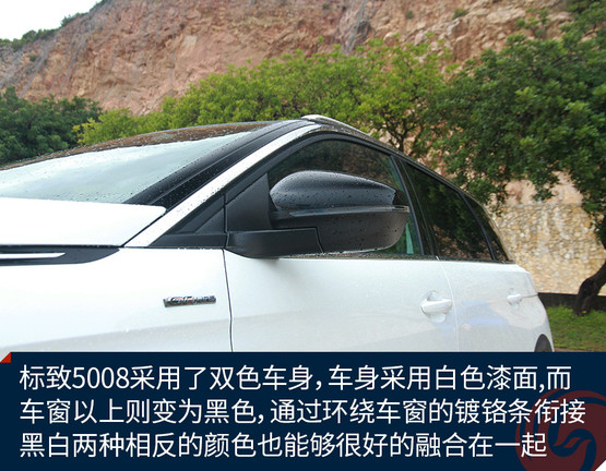 標(biāo)致5008采用了雙色車身,比如我們?cè)囻{的這一輛GT-Line版車型,車身整體采用白色漆面,而車窗以上的部分則變?yōu)楹谏?,通過環(huán)繞車窗的鍍鉻條銜接,黑白兩種相反的顏色也能夠很好的融合在一起。