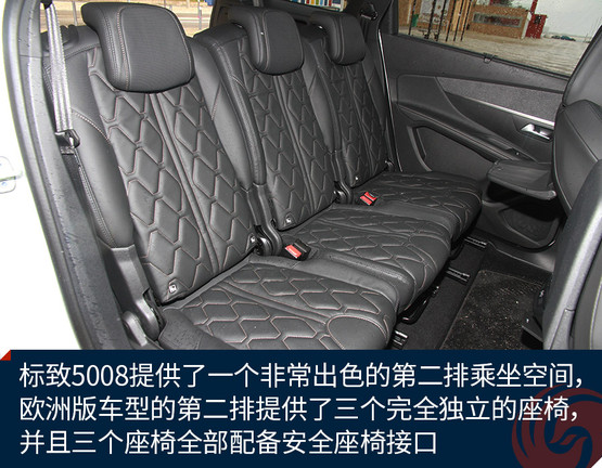 作為一款7座中型SUV,標(biāo)致5008最受關(guān)注的一點(diǎn)就是車內(nèi)空間的體驗(yàn)了,這里我就來多講一講。首先,標(biāo)致5008提供了一個(gè)非常出色的第二排乘坐空間,不夸張的說2840毫米的軸距基本上就是在為第二排乘客服務(wù)的。歐洲版車型的第二排提供了三個(gè)完全獨(dú)立的座椅,并且三個(gè)座椅全部配備安全座椅接口,而國產(chǎn)車型將會(huì)改為4/6分隔的座椅類型。