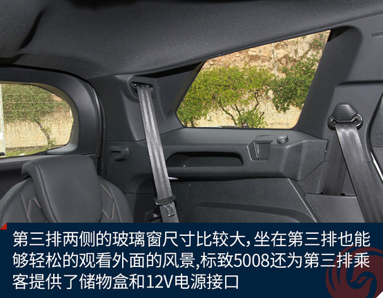 不過第三排也有值得表揚(yáng)的地方,首先正如前面所說,由于車身設(shè)計(jì)的比較方正,所以第三排的頭部空間比較理想,并不覺得特別頂頭;另外,第三排兩側(cè)的玻璃窗尺寸比較大,坐在第三排也能夠輕松的觀看外面的風(fēng)景;最后,標(biāo)致5008還為第三排乘客提供了儲(chǔ)物盒和12V電源接口,能夠滿足基本的使用需求。