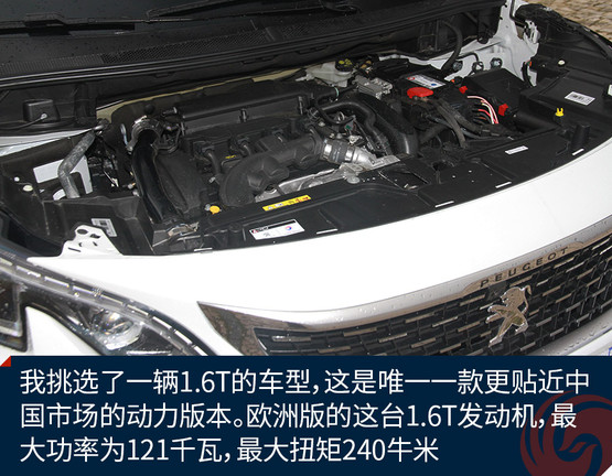 所以我挑選了一輛1.6T的車型,這是唯一一款更貼近中國市場(chǎng)的動(dòng)力版本。歐洲版的這臺(tái)1.6T發(fā)動(dòng)機(jī),最大功率為121千瓦,最大扭矩240牛米,大概相當(dāng)于國內(nèi)標(biāo)致4008 1.6T的350THP版本。