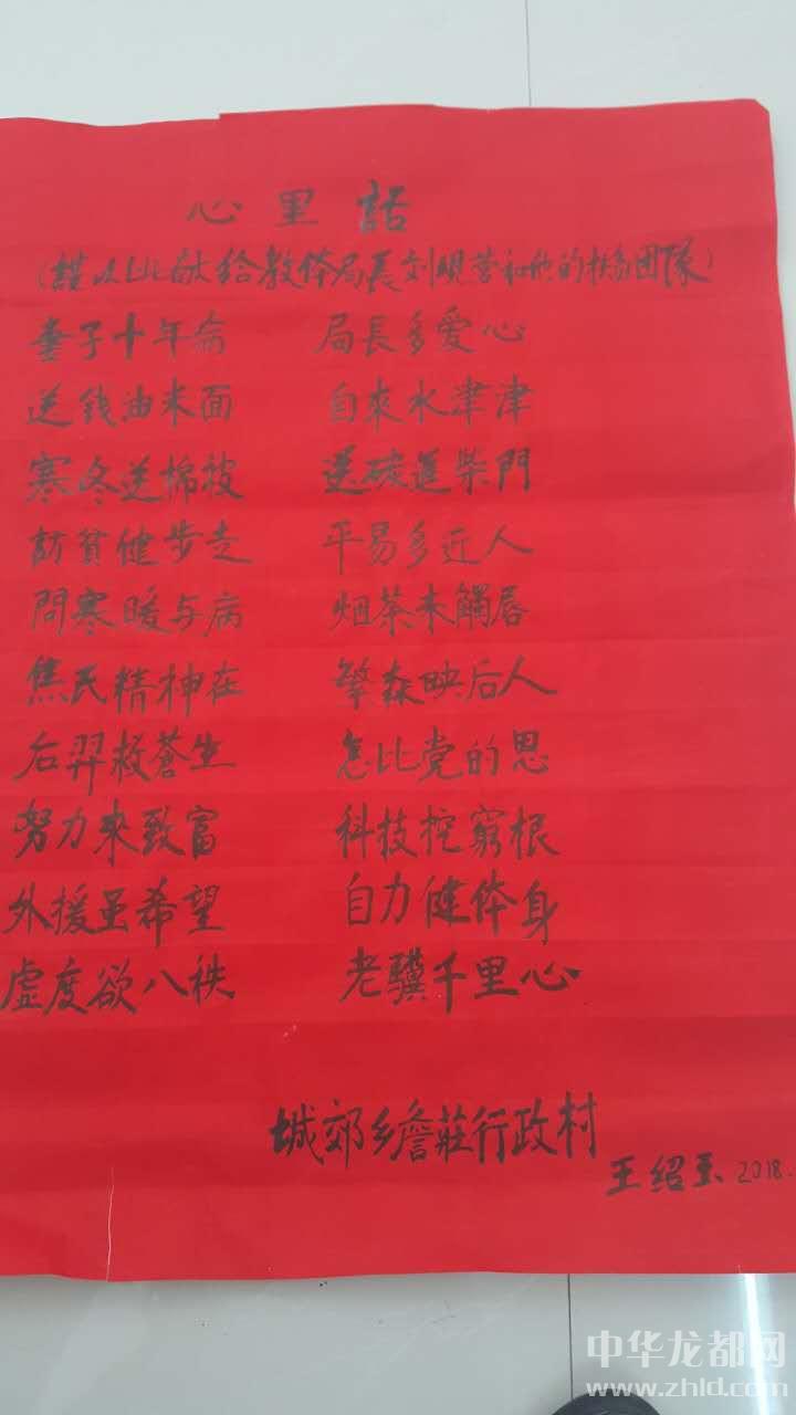 “我推敲了幾個(gè)半夜,寫了《心里話——謹(jǐn)以此獻(xiàn)給教體局局長(zhǎng)劉現(xiàn)營(yíng)和他的扶貧團(tuán)隊(duì)》這首五言排律,表表我和老伴及全村對(duì)您的感激之情?!薄捌拮邮瓴?,局長(zhǎng)多愛心。送錢米油面,自來(lái)水津津。寒冬送棉被,送炭至柴門。訪貧健步走,平易又近人?!蓖踅B玉聲情并茂地朗讀著,劉局長(zhǎng)爽朗地笑了,“老伴劉桂蘭藥按時(shí)吃了嗎?”“按時(shí)吃了,多虧您,到我家宣講扶貧政策,幫助我聯(lián)系有關(guān)單位,我老伴享受了慢性病醫(yī)保?!薄肮鹛m說(shuō),人家劉局長(zhǎng)隔三差五給咱送米面油,逢年過(guò)節(jié)給咱送慰問(wèn)金,前幾天頂風(fēng)冒雪送來(lái)兩床被子,一年不知來(lái)了多少趟,待咱比親人還親??!我家也沒(méi)有什么拿出手的,我倆一合計(jì),就發(fā)揮我的一點(diǎn)專長(zhǎng),給您寫了首詩(shī),您經(jīng)常去我家噓寒問(wèn)暖,我今個(gè)也來(lái)您這,算是走走親戚吧,回報(bào)回報(bào)您!”
