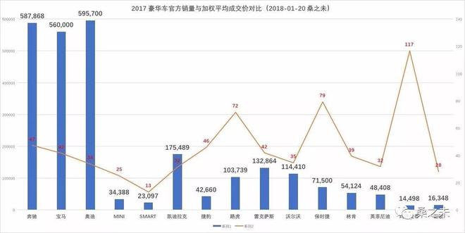 銷售的數(shù)量固然重要,但是銷售質(zhì)量也是評(píng)估銷售力不能忽視的重要指標(biāo)。衡量銷售質(zhì)量,“加權(quán)平均成交價(jià)”和“單車?yán)麧?rùn)”這兩個(gè)重要參數(shù),也許讓我們更直觀的看到車企的銷售能力與經(jīng)銷商單店經(jīng)營(yíng)質(zhì)量。這些更微觀的數(shù)據(jù)往往更能反映銷售公司及其經(jīng)銷商體系的銷售能力及水平?!凹訖?quán)平均成交價(jià)”反映車企的產(chǎn)品力與銷售公司的銷售能力,車企賣掉的車越多,單車價(jià)格越貴,品牌就越具有競(jìng)爭(zhēng)力,反之就需要考慮改進(jìn)產(chǎn)品,提升銷售管理能力?!皢诬?yán)麧?rùn)”指經(jīng)銷商銷售新車獲取的利潤(rùn),不含衍生利潤(rùn),一般在-4%-7%之間,如果單車?yán)麧?rùn)超過-2%,廠家需要考慮對(duì)經(jīng)銷商進(jìn)行補(bǔ)貼,如果利潤(rùn)超過7%,車企就會(huì)調(diào)整經(jīng)銷商浮動(dòng)返利。下面我們通過這兩個(gè)指標(biāo),來看哪些豪華車品牌在2017年表現(xiàn)更具實(shí)力。