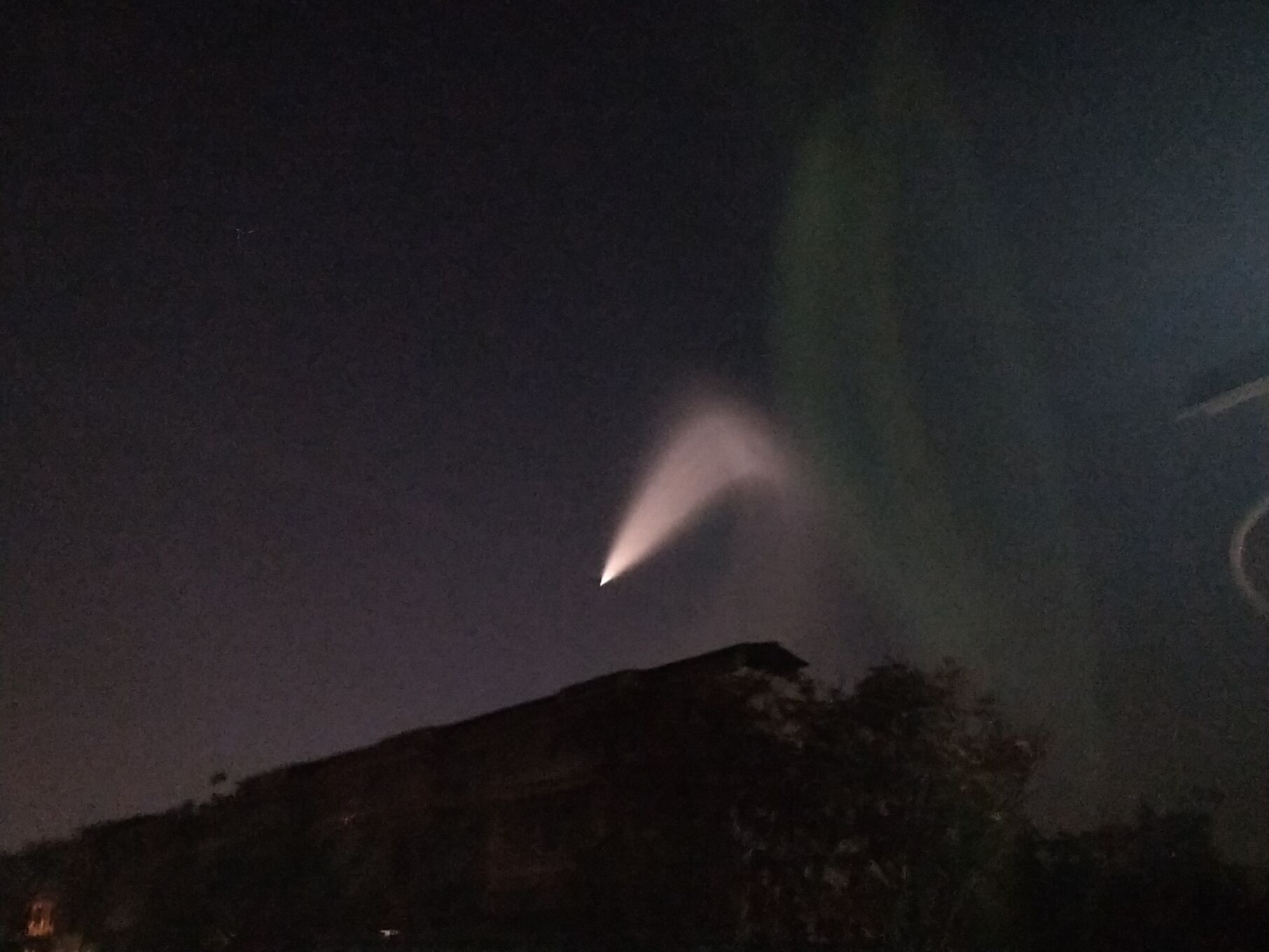 對于這個場景,正在周口市西華縣出差的河南省文聯(lián)工作人員王建坡也看到了。他給大河報·大河客戶端記者發(fā)來的圖片顯示,天空西北方向有一道扇形亮光,好像誰家的手電筒被扔到了天上。