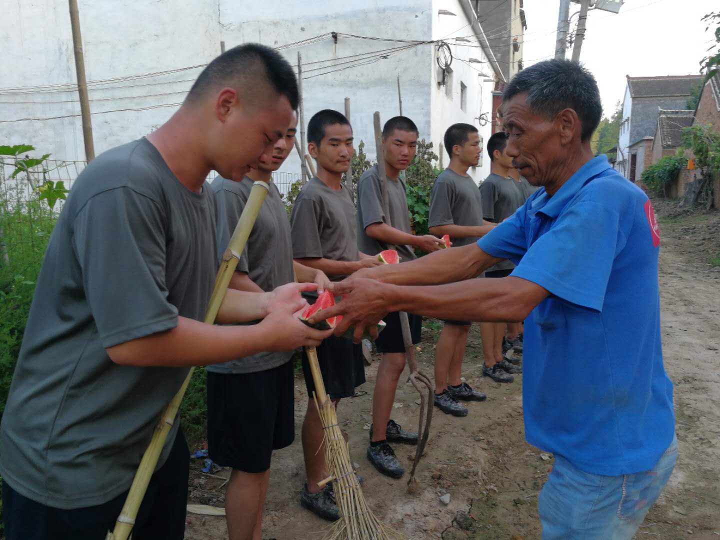 此次活動(dòng)深受鄉(xiāng)親們的贊賞和歡迎,有的老鄉(xiāng)拿出自家的勞動(dòng)工具,與我們 “小戰(zhàn)士”一起勞動(dòng),有的送來(lái)礦泉水和西瓜慰勞正在勞動(dòng)中的“小戰(zhàn)士”,展現(xiàn)出了一幅軍愛(ài)民、民擁軍,軍民魚(yú)水情深的畫卷。