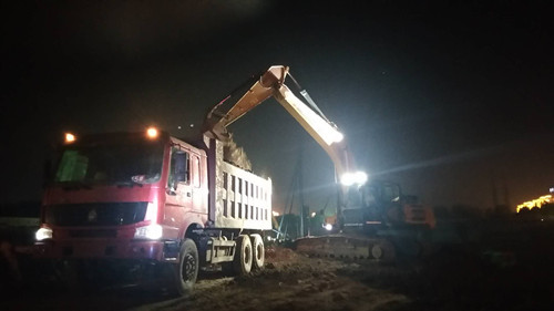 在德和家園施工現(xiàn)場(chǎng),雖近22時(shí),挖掘機(jī)依然揮舞著鐵臂在不停地挖土,渣土車來來往往地運(yùn)送著土方,靜謐的夜空在德和家園的施工現(xiàn)場(chǎng)也躁動(dòng)起來。