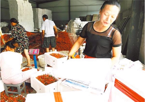 該鎮(zhèn)采取統(tǒng)一包裝、統(tǒng)一品牌、統(tǒng)一儲(chǔ)存、統(tǒng)一銷(xiāo)售經(jīng)營(yíng)銷(xiāo)售模式,吸引大批外地商戶上門(mén)收購(gòu)辣椒。