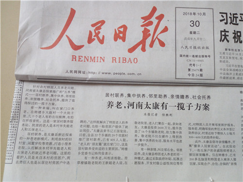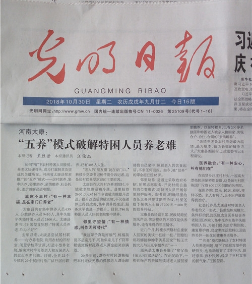 為助力脫貧攻堅,有效提高農(nóng)村特困老人整體供養(yǎng)水平,太康縣民政局、縣扶貧辦等部門在縣委、縣政府正確領導下,按照“一戶一策、一人一法”原則,創(chuàng)新實施集中供養(yǎng)、親情贍養(yǎng)、社會托養(yǎng)、居村聯(lián)養(yǎng)、鄰里助養(yǎng)“五養(yǎng)”模式,有效破解了特困老人的脫貧和養(yǎng)老難題。該做法經(jīng)《周口日報》率先報道后,國家級、省級媒體紛紛慕名前往太康采訪。截至目前,百余家媒體或網(wǎng)站相繼報道了太康“五養(yǎng)”模式。10月30日,《人民日報》《光明日報》分別以《養(yǎng)老,河南太康有了一攬子方案》《河南太康:“五養(yǎng)”模式破解特困人員養(yǎng)老難題》為題重磅介紹了太康“五養(yǎng)”模式經(jīng)驗。10月30日,人民日報海外版官方網(wǎng)站還以《河南太康:“五養(yǎng)”模式來了 特困人員笑了》為題作了報道。據(jù)了解,國家級3家主流媒體同一天內(nèi)報道同一工作經(jīng)驗,在太康縣宣傳史上尚屬首次。