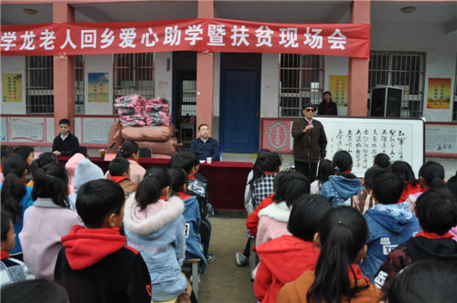雖然身在北京,但于學(xué)龍老人的心始終牽掛著故鄉(xiāng)。11月5日,他回到老家商水縣黃寨鎮(zhèn),用自己的退休金,為母校埠口小學(xué)的孩子送來(lái)一批嶄新的書包和自己創(chuàng)作的書法精品?!坝H愛(ài)的小校友們,你們背上書包上學(xué)就更方便了,希望你們好好學(xué)習(xí)、茁壯成長(zhǎng),將來(lái)成為社會(huì)棟梁,報(bào)效國(guó)家。”于學(xué)龍對(duì)孩子們說(shuō)。