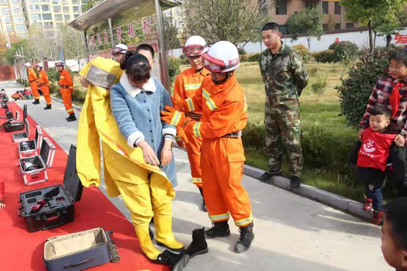 為持續(xù)推進“119消防宣傳月”活動,提高在校師生的消防安全意識和自防自救能力,11月20日,鄲城縣城關鎮(zhèn)羅堂小學100余名師生走進鄲城消防大隊營區(qū),零距離體驗消防員生活,學習消防安全知識。圖為消防隊員幫助小學生試穿消防戰(zhàn)斗服。