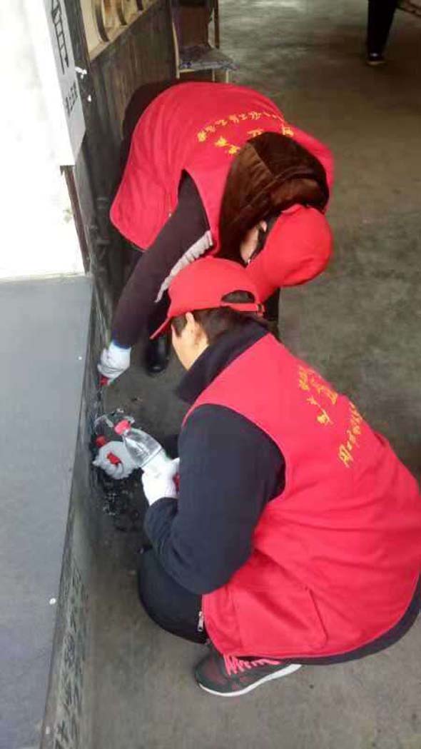 為了加快清理的速度,有的志愿者兩兩搭班,一個人用瓶裝水噴在小廣告處,另一個則趕忙用抹布進行擦拭。別小瞧這些小廣告,清理起來很費時、費力,有時候一個小廣告需要花費五、六分鐘的時間才能清理干凈,讓人累的手臂酸麻。