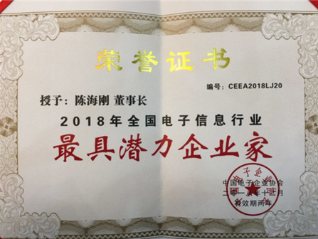 在當(dāng)日下午召開的全國電子信息行業(yè)優(yōu)秀企業(yè)家表彰大會(huì)上,公司董事長陳海剛榮獲“2018年全國電子信息行業(yè)最具潛力企業(yè)家”榮譽(yù)稱號(hào)。