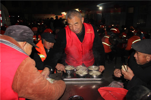 志愿者王剛負責維護現(xiàn)場秩序,6點10分準時開飯,志愿者按豎排整體端送,環(huán)衛(wèi)工人8人一桌,通道暢通,現(xiàn)場就像農村吃大席一般、好不熱鬧。