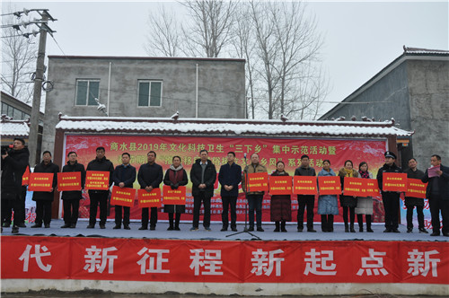 1月10日上午,雪花飛舞,天寒地凍。然而,商水縣袁老鄉(xiāng)王屯行政村文化大院暖 意融融,千人歡聚,同樂同慶,共享黨的溫暖。由縣委宣傳部、縣文明辦、縣文廣局 等部門聯(lián)合舉辦的商水縣2019年文化、科技、衛(wèi)生“三下鄉(xiāng)”啟動儀式在這里舉行。