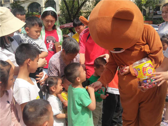 活動(dòng)中,工作人員精心穿著卡通人偶服裝與小朋友們熱情互動(dòng)、做游戲,天氣雖然炎熱,但孩子們卻忙的不亦樂乎,家長們喜笑顏開,一派祥和、歡樂的氣氛。
