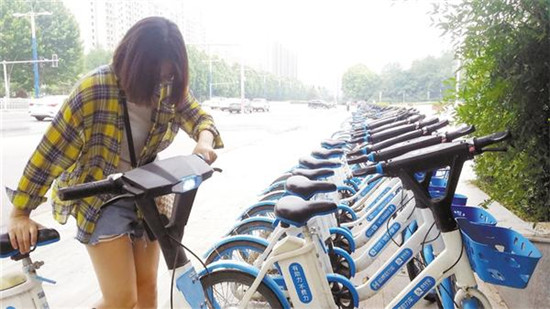 6月19日,一位市民在周口師范學(xué)院南門掃單車出行。