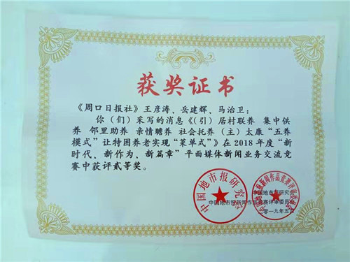 河南新聞獎(jiǎng)是河南省新聞界最高獎(jiǎng)。日前,經(jīng)過(guò)初評(píng)、復(fù)評(píng)、定評(píng)、公示等一系列環(huán)節(jié)后,《周口日?qǐng)?bào)》二版頭題刊發(fā)的《太康“五養(yǎng)模式”讓特困養(yǎng)老實(shí)現(xiàn)“菜單式”》(作者:王彥濤 岳建輝 馬治衛(wèi) 編輯:魏東 李鳳霞)喜獲河南新聞獎(jiǎng)一等獎(jiǎng),成為周口市唯一獲得一等獎(jiǎng)的新聞作品。同時(shí),《太康“五養(yǎng)模式”讓特困養(yǎng)老實(shí)現(xiàn)“菜單式”》還榮獲了中國(guó)地市報(bào)新聞獎(jiǎng)二等獎(jiǎng),可謂“雙喜臨門(mén)”。