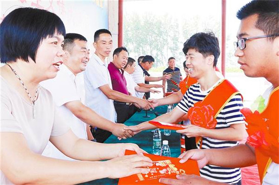 近日,市城鄉(xiāng)一體化示范區(qū)搬口辦事處曾樓行政村文化大院里,鑼鼓喧天,喜氣洋洋,熱鬧非凡。原來是村民在為該村大學(xué)新生舉辦歡送會,同時,該村黨支部還為這些大學(xué)新生發(fā)放了助學(xué)金。據(jù)了解,曾樓行政村有3000多人,2019年共有27人金榜題名,其中14人考入本科院校,13人考入??圃盒?。記者 張勁松 攝