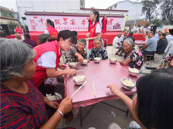 與此同時,在演出現(xiàn)場附近的村委大院內(nèi),由周口市慈孝文化促進會、北斗達教育集團等組成的200多名志愿團隊正忙得不亦樂乎,調(diào)餡、包餃子、下鍋、端盤,兩個多小時內(nèi),他們精心包出20000多個愛心水餃。11時30分,餃子宴正式開始,老人們一邊吃著水餃一邊觀看者演出,喜笑顏開,呈現(xiàn)出一片相親相敬的溫馨畫面。