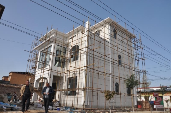 11月20日,在全國文明村——商水縣巴村鎮(zhèn)上城村,村民朱云山家的3層輕鋼別墅正在建造中。這是該村第一幢新式別墅,全框架結(jié)構(gòu),造型別致,沒有使用砂石、水泥、磚瓦等,全部使用新型環(huán)保建材,建造過程就像搭積木一樣,并具有節(jié)能環(huán)保、防風(fēng)抗震、隔音防火、造價(jià)低廉、建造快等特點(diǎn),很受喜歡。圖為附近村民前來參觀。記者 付永奇 攝