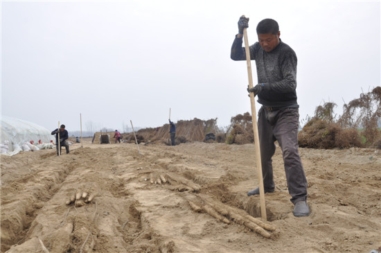 11月26日,沈丘縣白集鎮(zhèn)40多歲的耿金中與另外兩個(gè)同伴一起來到周口城鄉(xiāng)一體化示范區(qū)許灣鄉(xiāng)肖王莊,未來的一段時(shí)間,他們吃住都將在這里進(jìn)行,直到將這一區(qū)域的山藥挖完。耿金中說,他挖山藥已經(jīng)有20多年了,20多年前,沈丘縣大規(guī)模種植山藥,每到收獲時(shí),會(huì)有很多山東挖山藥工人來這里挖山藥。他看到這個(gè)行當(dāng)能賺錢,就開始學(xué)挖山藥技術(shù)。此后的多年,他先后到山西、湖北、安徽等地挖山藥。