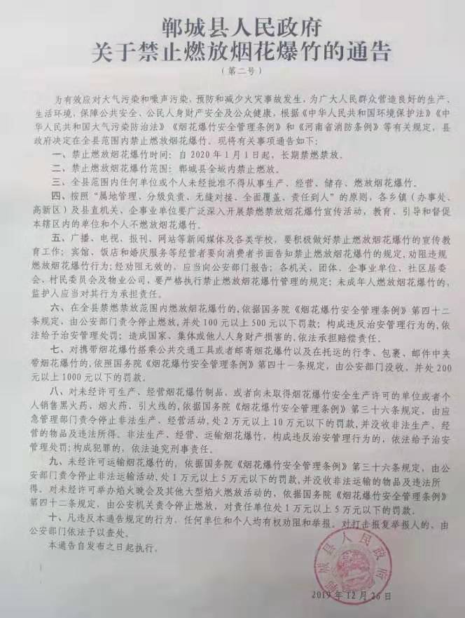 鄲城縣人民政府關(guān)于禁止燃放煙花爆竹的通告