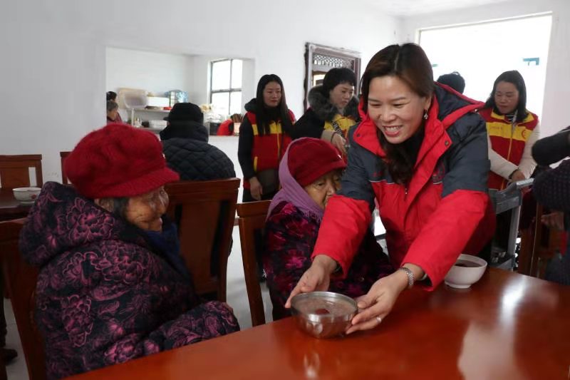 “開飯嘍!”中午時分,志愿者們將老人一一攙扶到餐廳坐下,隨后將一碗碗香氣四溢、且冒著熱氣的八寶粥端到老人跟前?!跋悖嫦?!”80歲的黃柏功老人舀了一勺八寶粥放到嘴里品了品笑著說。吃著八寶粥,老人想起了以前的艱苦生活,他禁不住激動地哭了起來:“以前,吃了上頓沒下頓,想吃一塊白面饃,都得等到過年。可現(xiàn)在,天天不斷肉,生活越來越好。這都是共產(chǎn)黨給咱的福啊。”