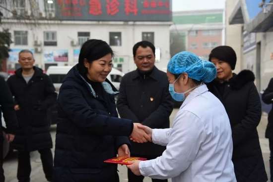 鄲城縣第一醫(yī)療健康服務(wù)集團(tuán)作為河南省新型肺炎救治定點(diǎn)醫(yī)院時(shí)刻牽動(dòng)著縣委縣政府領(lǐng)導(dǎo)的心。1月23日,縣委書記羅文閣、縣政府縣長(zhǎng)李全林、縣政府副縣長(zhǎng)肖煒來到縣醫(yī)院親切慰問一線醫(yī)護(hù)人員,并給一線工作人員帶去春節(jié)祝福。