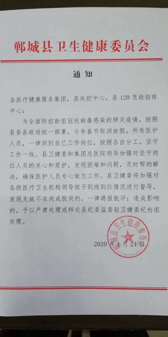 在全國(guó)疫情防控形勢(shì)較為嚴(yán)重情況下,衛(wèi)健委充分認(rèn)識(shí)到加強(qiáng)新型肺炎疫情防治工作的重要性和急迫性,于1月24下發(fā)取消全縣醫(yī)護(hù)人員春節(jié)假期的通知。要求所有醫(yī)護(hù)人員,一律回到自己工作崗位,按照各自分工,堅(jiān)守工作一線。