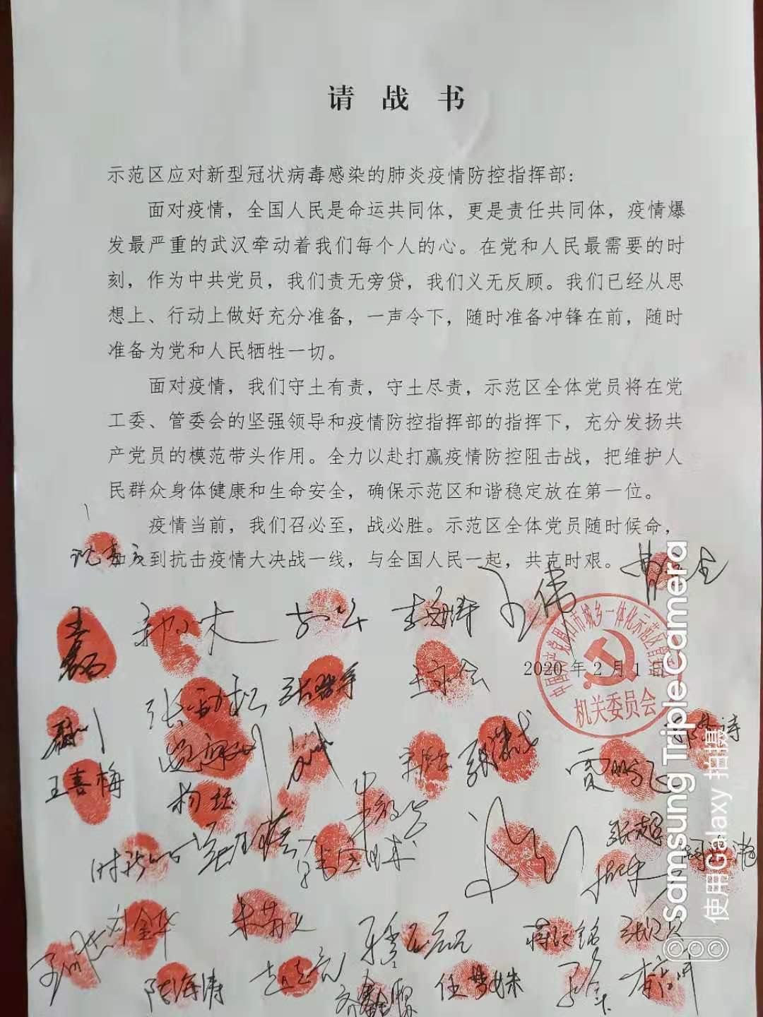 為了能到戰(zhàn)“疫”一線,示范區(qū)廣大黨員干部紛紛簽下“請戰(zhàn)書”,自愿要求加入到抗擊新型冠狀病毒感染的肺炎疫情戰(zhàn)斗中去?!罢垜?zhàn)書”上,他們紛紛按下鮮紅的指印,在指印下面,是每個(gè)黨員堅(jiān)定的簽名,從這些指印和簽名可以看出每個(gè)黨員堅(jiān)定的黨性和為了抗擊疫情大無畏的英雄氣概。