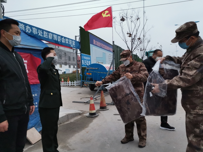 在淮河路辦事處趙寨居委會(huì)執(zhí)勤點(diǎn),探親在家兩名現(xiàn)役戰(zhàn)士趙為為、趙繼周疫情發(fā)生后堅(jiān)持在防控一線執(zhí)勤點(diǎn)執(zhí)勤。當(dāng)晚6時(shí)許,天色漸黑,了解到這一情況后,部長(zhǎng)和政委依然驅(qū)車趕到現(xiàn)場(chǎng),詳細(xì)了解兩名戰(zhàn)士的服役情況,并給他倆每人送了一件軍用大衣,提醒注意自身安全,有啥需求第一時(shí)間和武裝部溝通聯(lián)系。