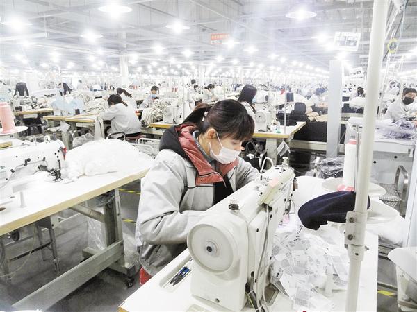2月26日,商水縣阿爾本制衣有限公司的員工正在生產(chǎn)車間加工服裝。商水縣在嚴(yán)格做好疫情防控的同時(shí),又做好企業(yè)復(fù)工復(fù)產(chǎn)工作。目前,該縣10家大型企業(yè)和6個(gè)扶貧車間有返崗人員3萬多人。喬連軍攝