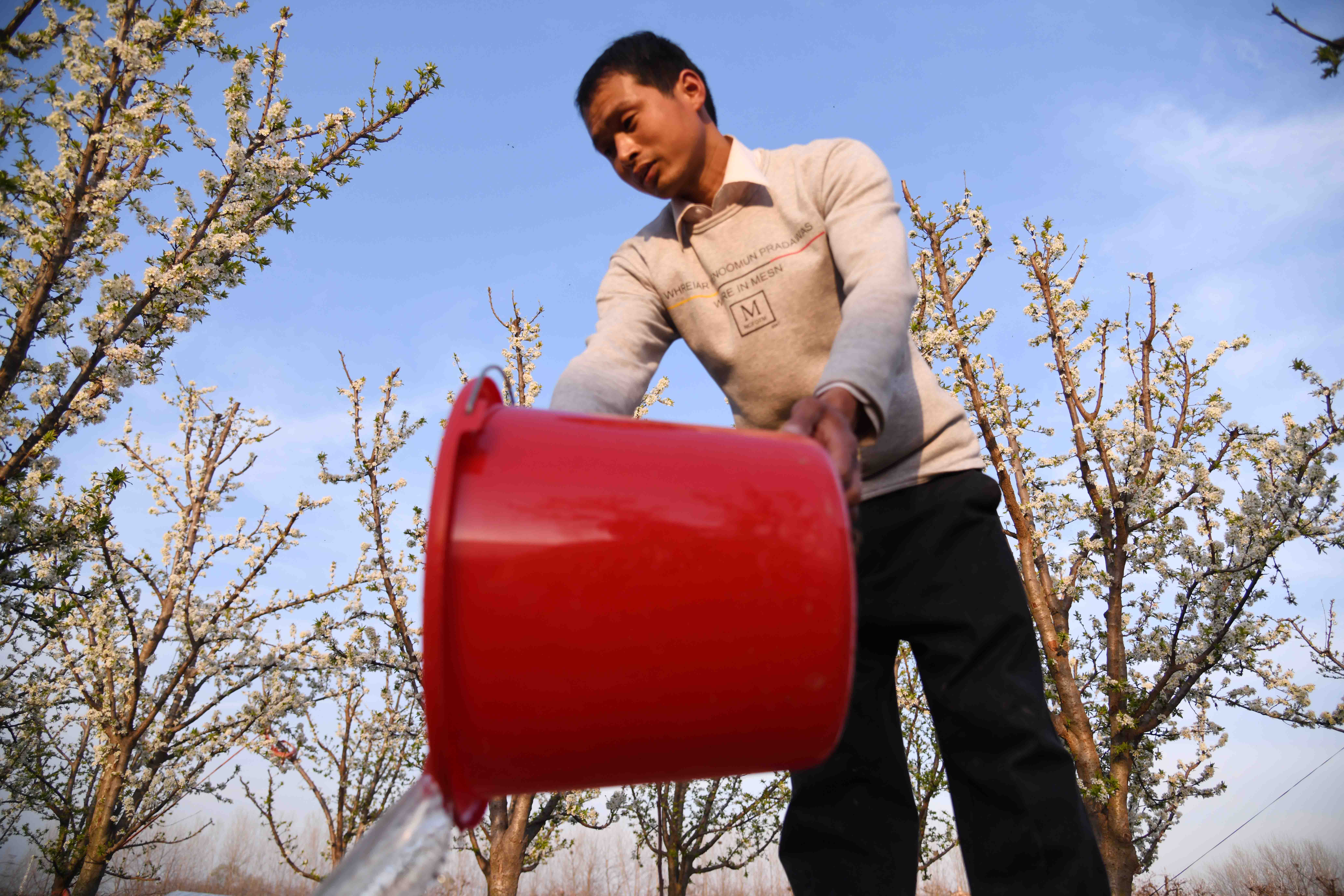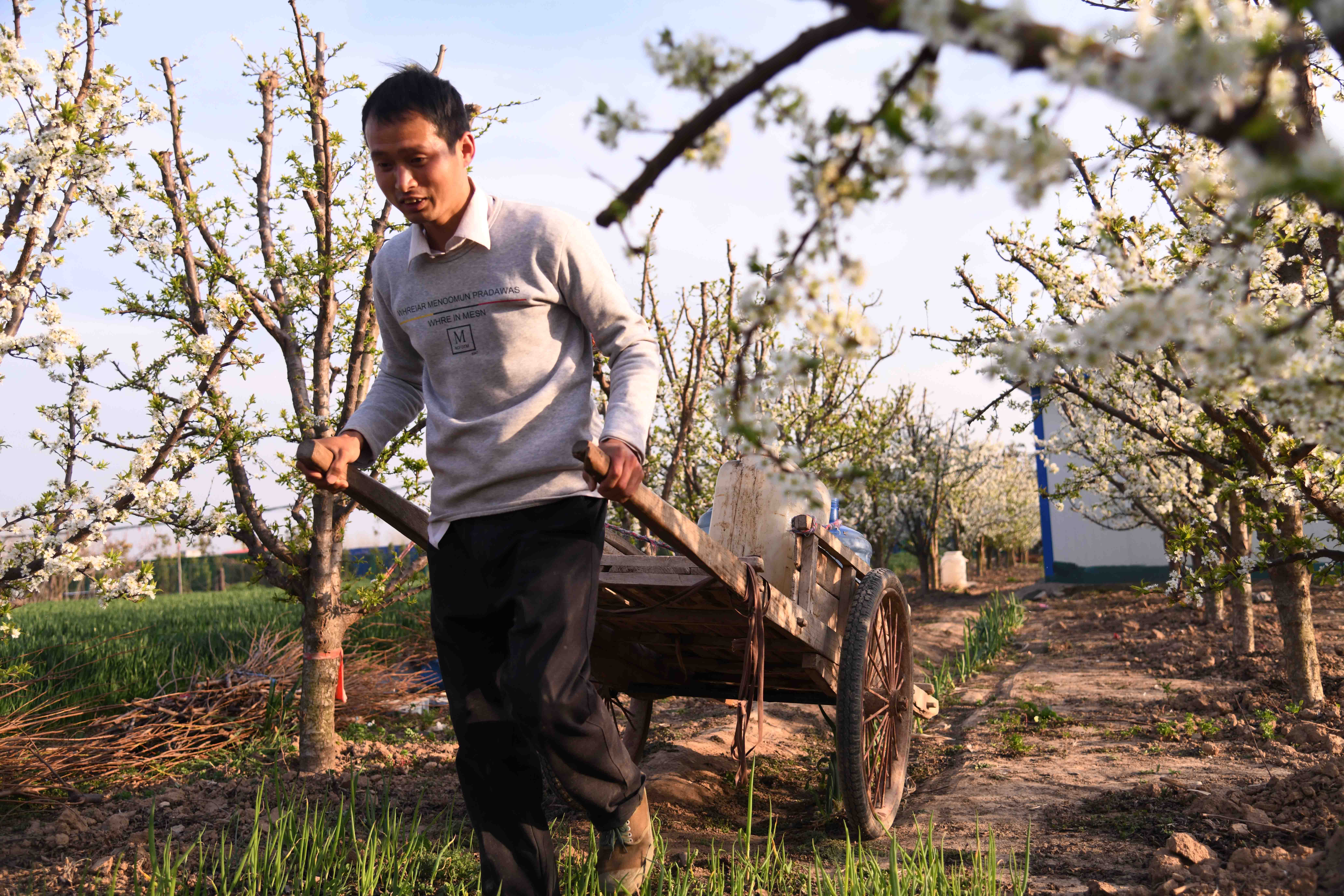 記者在一家果農的果園里看到,果園在春陽下,李子花滿園濃放,滿樹花朵潔白如玉,芳香四溢,宛如置身人間仙境。果農正忙著為果樹澆水,侍弄新栽的果苗。何莊村果園有三四百畝,種植有桃樹、蘋果樹、梨樹、李子樹、柿樹等,是附近有名的果樹種植村,成為村里的重要副業(yè),每年夏秋季節(jié),這里瓜果飄香,吸引很多城里人和附近村民前來購買。