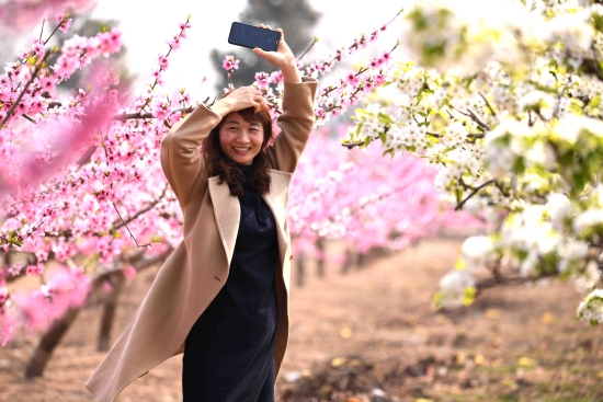 近日,泛區(qū)農(nóng)場萬畝果園內(nèi)梨花、桃花競相盛放,粉色桃花似錦,白色梨花如玉砌,置身其中,宛如人間仙境,吸引了不少游客前來觀賞。
