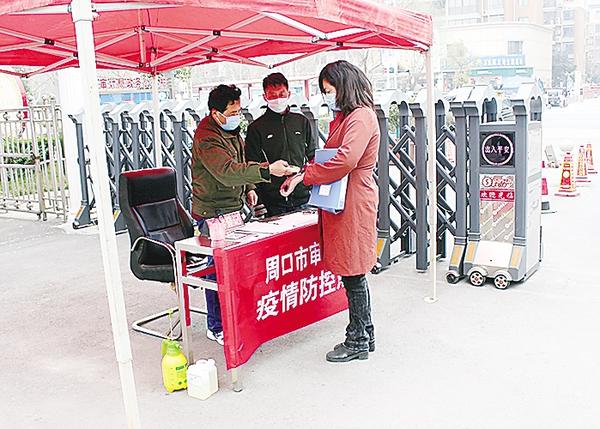 周口市審計局對進入單位人員認(rèn)真測量體溫。方清 攝