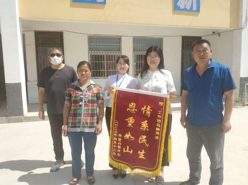 5月19日,太康縣王集鄉(xiāng)焦堂行政村張草帽自然村村民萬勤霞來到焦堂村小學,將一面繡有“情系民生 恩重如山”的錦旗送到了該縣紀委常委、監(jiān)委委員馬靜,工作組成員王向花、馬景華、張海亮手中,感動的淚水忍不住地流。