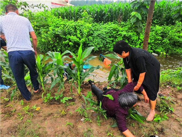 7月26日,連續(xù)多日的降雨已導(dǎo)致農(nóng)村坑滿河平、積水頗深。當(dāng)日下午4時,依然時雷聲陣陣、雨如豆粒,二人在宜路鎮(zhèn)張寨村小學(xué)附近的玉米田間拍照核查“圖斑”時,看到一輛車箱內(nèi)載有幾位老人的電動三輪車冒雨從路邊疾駛過去。緊接著聽到“撲通”一聲,趙文波、李偉二人立即意識到是三輪車掉進路溝、落水了。