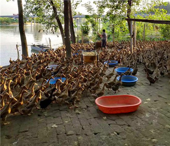 為了擴(kuò)大變蛋原料來(lái)源,她與當(dāng)?shù)丶巴獾囟嗉茵B(yǎng)雞企業(yè)簽訂訂單協(xié)議,滿足自己加工變蛋需要。為了滿足鴨蛋貨源,她在潁河灣一個(gè)支流處新建一個(gè)養(yǎng)鴨基地,目前養(yǎng)鴨5000余只,日產(chǎn)鴨蛋5000枚,基本滿足當(dāng)前加工咸鴨蛋需要。