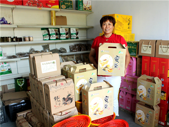 幾年前,孔粉蓮曾干過(guò)建材生意,賣(mài)過(guò)油漆、涂料等,但最讓她得心應(yīng)手的還是經(jīng)營(yíng)當(dāng)?shù)氐霓r(nóng)特產(chǎn)品。她在村里開(kāi)了一家小門(mén)店,代銷(xiāo)當(dāng)?shù)氐暮睖?、石磨面、食用菌、紅薯粉條等,顧客贏門(mén),生意很是紅火。