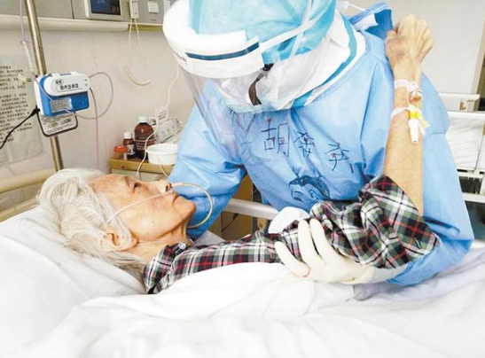 在武漢醫(yī)院,今年84歲的楊守振不僅感染新冠肺炎,而且有嚴(yán)重的營養(yǎng)不良,插著胃管,身體極為消瘦,生活不能自理。為了不讓老人出現(xiàn)壓瘡,胡奔奔需要每隔一個小時為老人翻一次身。翻身時候,為了讓老人更舒服一點(diǎn),她每次都像抱孩子一樣把老人抱在懷里,動作輕柔地按摩老人受壓的部位,防止壓瘡的形成。