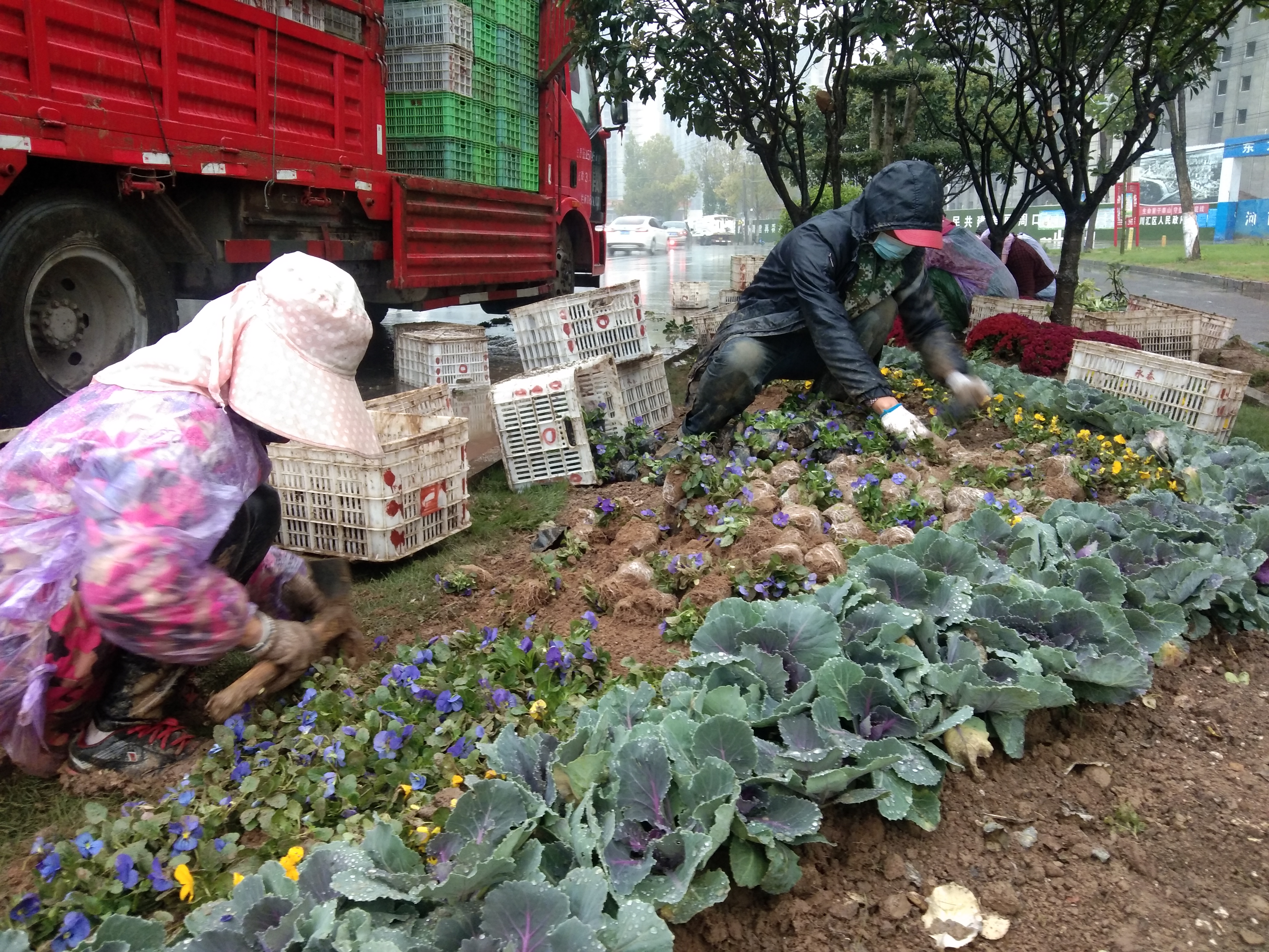 10月14日早晨,記者在周口中心城區(qū)七一路東段看到,幾名園藝工人正在道路邊的綠化帶內栽種黃色、紫色的花兒。當日,周口中心城區(qū)下起了淅淅瀝瀝的小雨,可是園藝工人卻全然不顧這些,抓住有利時機栽種花木,提高存活率,助力“創(chuàng)文”。記者 張洪濤 攝