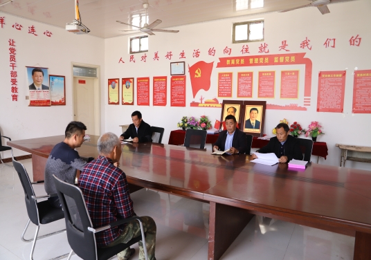 (接到鄭德民躺在病床上布置工作的電話,縣自然資源局駐土趙行政村第一書記王玉杰、土趙行政村主任邱成明心懷悲痛立即召開村干部會議落實。鄭德民的位置是空的。)