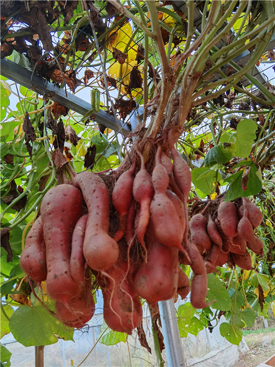 西華縣農(nóng)科所積極開展“空中結(jié)薯”試驗種植研究,并取得成功。“空中結(jié)薯”采取嫁接技術(shù),選用旋花科植物牽牛作砧木,脫毒薯苗作接穗嫁接而成,嫁接成活后栽到土壤里,搭建棚子,加強薯苗水肥管理,每株插一根小竹木桿,促進薯苗快速生長上棚,在棚上吊花盆,盆內(nèi)放蛭石,生長到掤上的薯秧壓到花盆里,加強水肥管理。90天結(jié)薯,進入10月份把花盆去掉。該技術(shù)打破傳統(tǒng)栽培方式,主要為公園、科技園區(qū)、農(nóng)業(yè)生態(tài)觀光園、家庭庭院內(nèi)培植,有很好的科研價值、觀賞價值和農(nóng)業(yè)推廣價值。周口日報·周道客戶端記者李鳳霞 攝