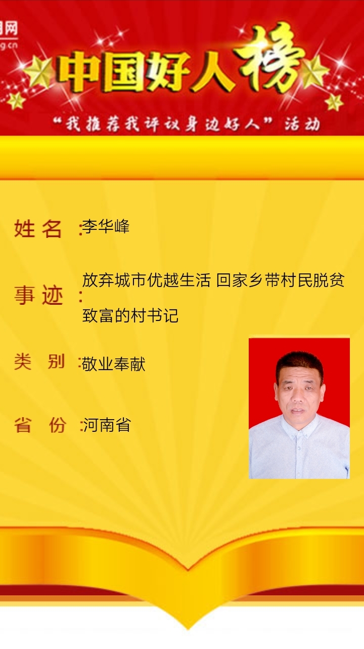 昨日,記者從市文明辦獲悉,今年46歲現(xiàn)任太康縣轉(zhuǎn)樓鎮(zhèn)李報真行政村黨支部書記的李華峰,放棄城市優(yōu)越生活,回鄉(xiāng)帶領(lǐng)村民致富,榮登2020年10月份“敬業(yè)奉獻(xiàn)”類“中國好人榜”。至此太康縣中國好人達(dá)到67人。