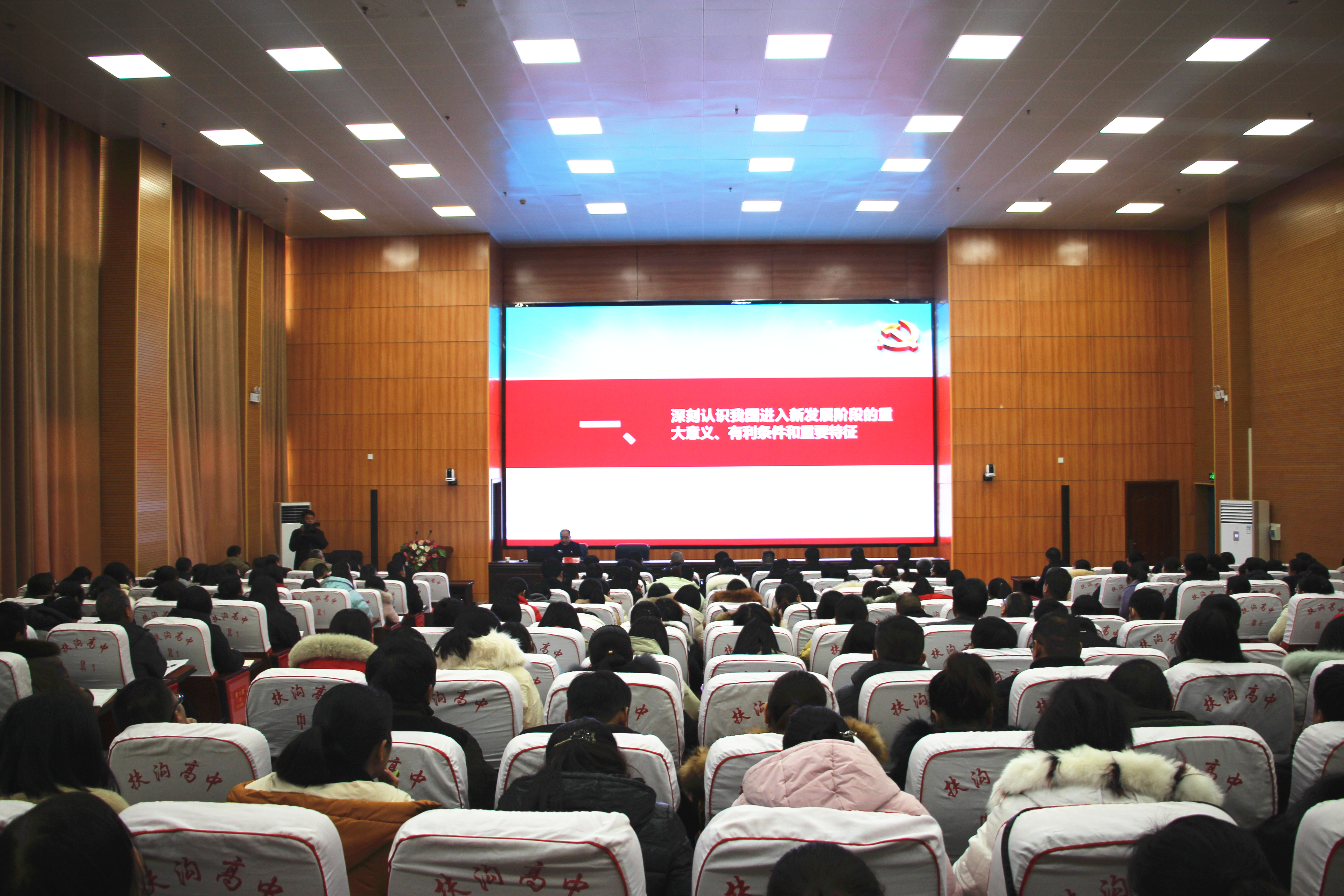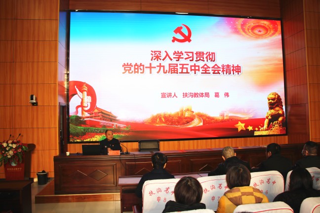 12月12日下午,扶溝縣高中德馨樓七樓會議室掌聲陣陣、座無虛席,扶溝縣學習貫徹黨的十九屆五中全會精神縣委宣講團縣高中報告會正在這里舉行,宣講會特邀縣教體局黨組書記葛偉進行宣講,局機關班子成員,縣高中班子成員和400余名教師參加了宣講會。